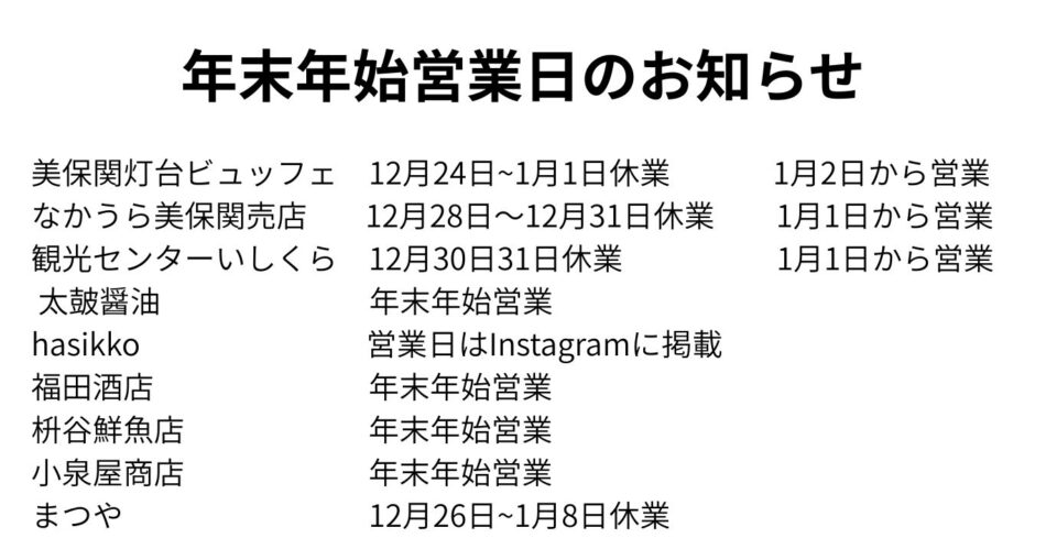 島根半島の東端の地、島根県松江市美保関町は、三方を海で囲まれた岬です。 この岬は、出雲神話に由来する神々と、美しい海と、伝統を守り伝える人々の住む、特別な土地。 詳しくはこちら 2025年12月23日 イベント 年末年始営業日のお知らせ 2025年12月16日 イベント 令和8年 美保神社初詣 渋滞対策・交通のご案内 2025年12月16日 イベント 令和8年美保神社 初詣 初ゑびす祭 More ノスタルジックな雰囲気にあふれた、 美保関のスタンダード。 良縁に恵まれる、 ふたつの神社を結ぶ「両参り」 美しい自然を五感で堪能する、 神秘とレジャー。 観光からお土産まで おすすめスポット一覧はこちら 動画はこちら 美保関へのアクセスはこちらから