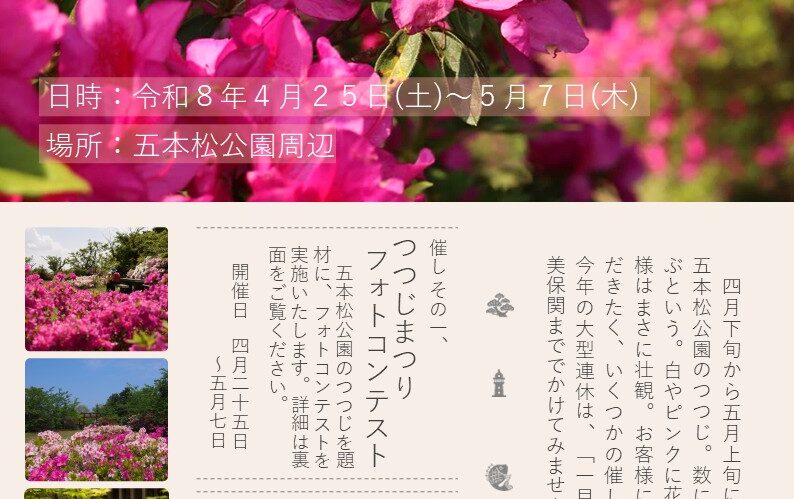 島根半島の東端の地、島根県松江市美保関町は、三方を海で囲まれた岬です。 この岬は、出雲神話に由来する神々と、美しい海と、伝統を守り伝える人々の住む、特別な土地。 詳しくはこちら 2026年4月10日 イベント 五本松公園つつじまつり 令和8年4月25日~ 2026年4月3日 イベント 路線バス・美保関町コミュニティバス時刻表変更について 2026年3月31日 イベント まちあるきガイド 料金変更について More ノスタルジックな雰囲気にあふれた、 美保関のスタンダード。 良縁に恵まれる、 ふたつの神社を結ぶ「両参り」 美しい自然を五感で堪能する、 神秘とレジャー。 観光からお土産まで おすすめスポット一覧はこちら 動画はこちら 美保関へのアクセスはこちらから