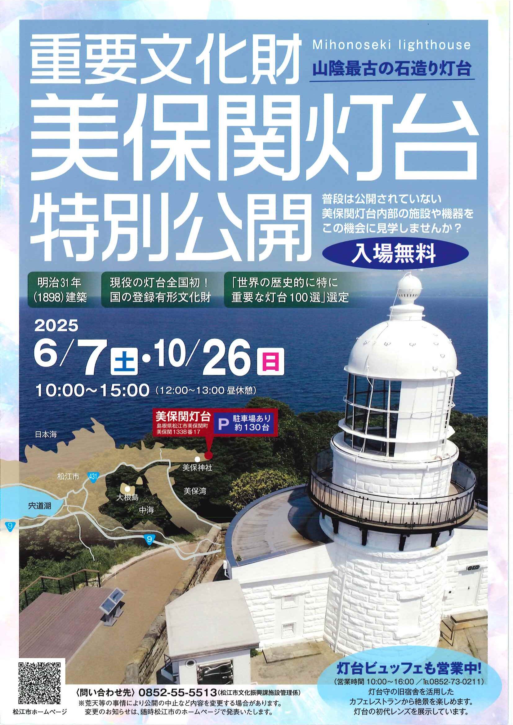 イベント 2025年6月2日 美保関灯台 特別公開について 6月7日(日)10:00~15:00(12:00~13:00) 普段は公開されていない美保関灯台内部が特別公開されます。 入場無料です。 山陰最古の石造り灯台であり、世界の歴史的に特に重要な灯台100選に選ばれている美保関灯台を ぜひ見にいらしてください。