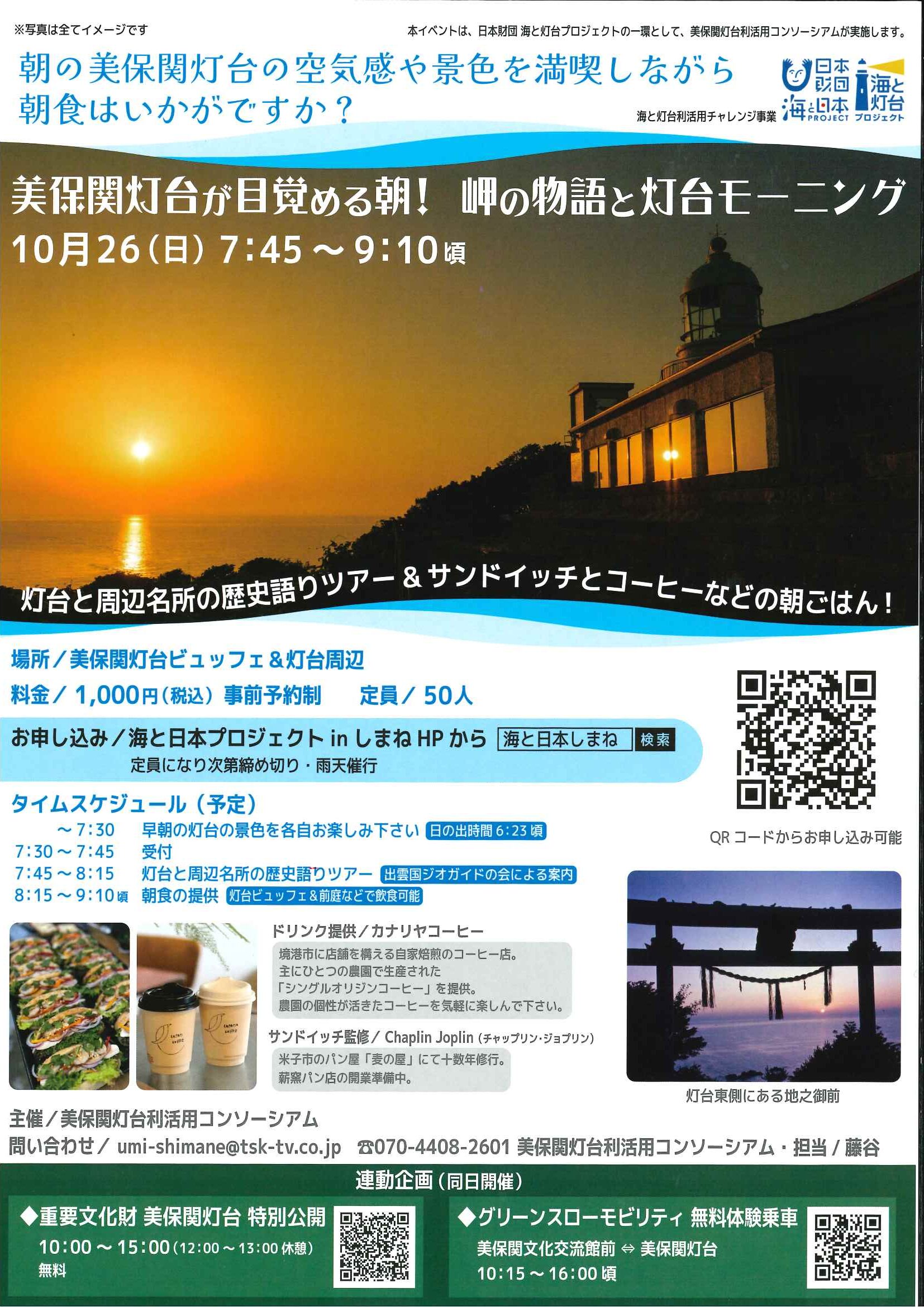美保関灯台が目覚める朝! 岬の物語と灯台モーニングが10月26日(日)に開催されます。