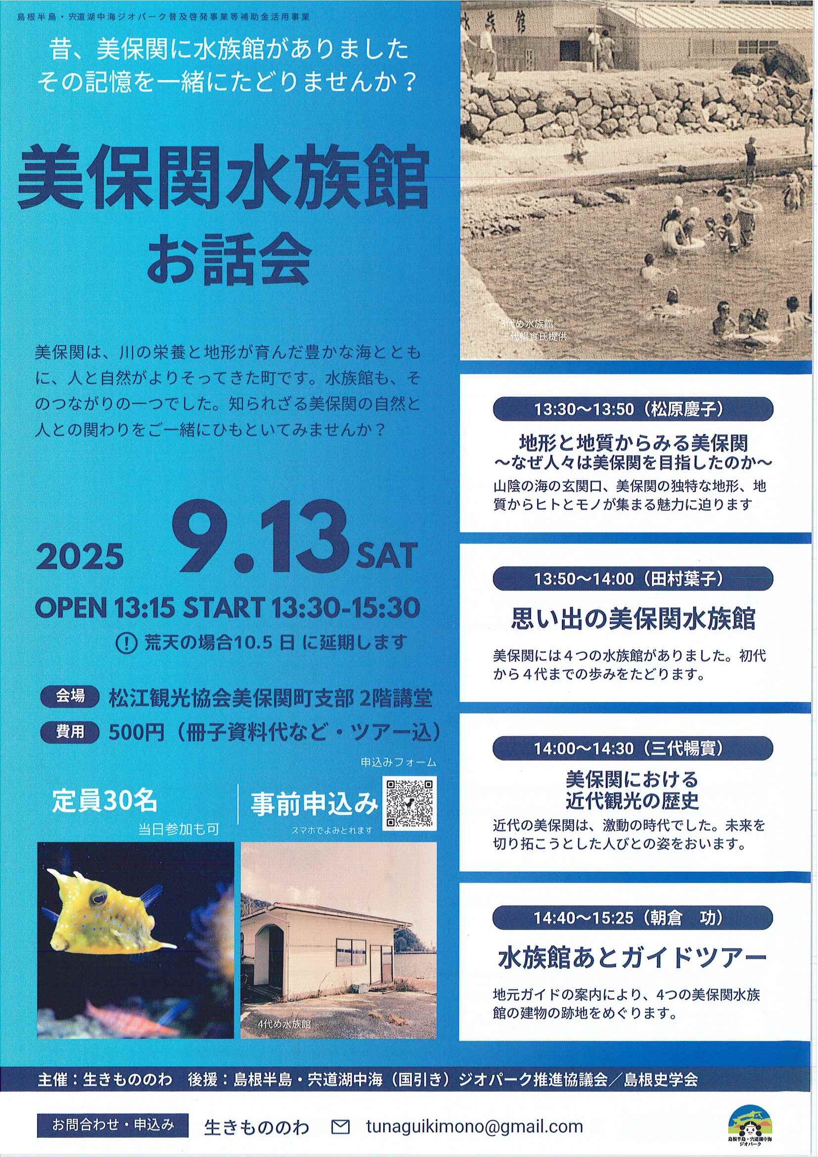 2025年8月19日 美保関水族館 お話会 昔、美保関に水族館がありました。その記憶を一緒にたどりませんか? お問い合わせ・申込み 生きもののわ メール tunaguikimono@gmail.com *お問い合わせは、↑のメールにてお願いいたします。